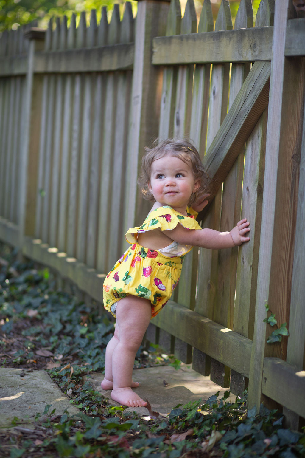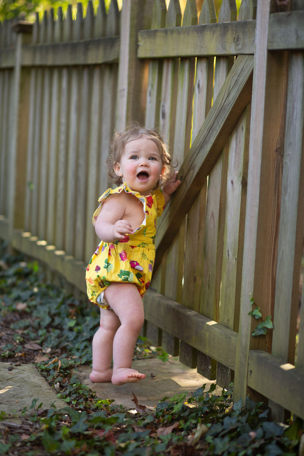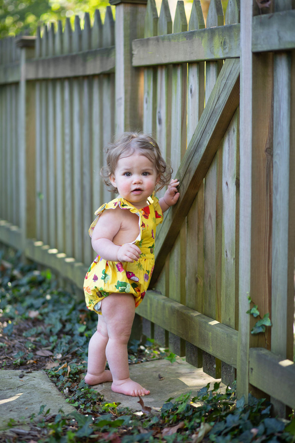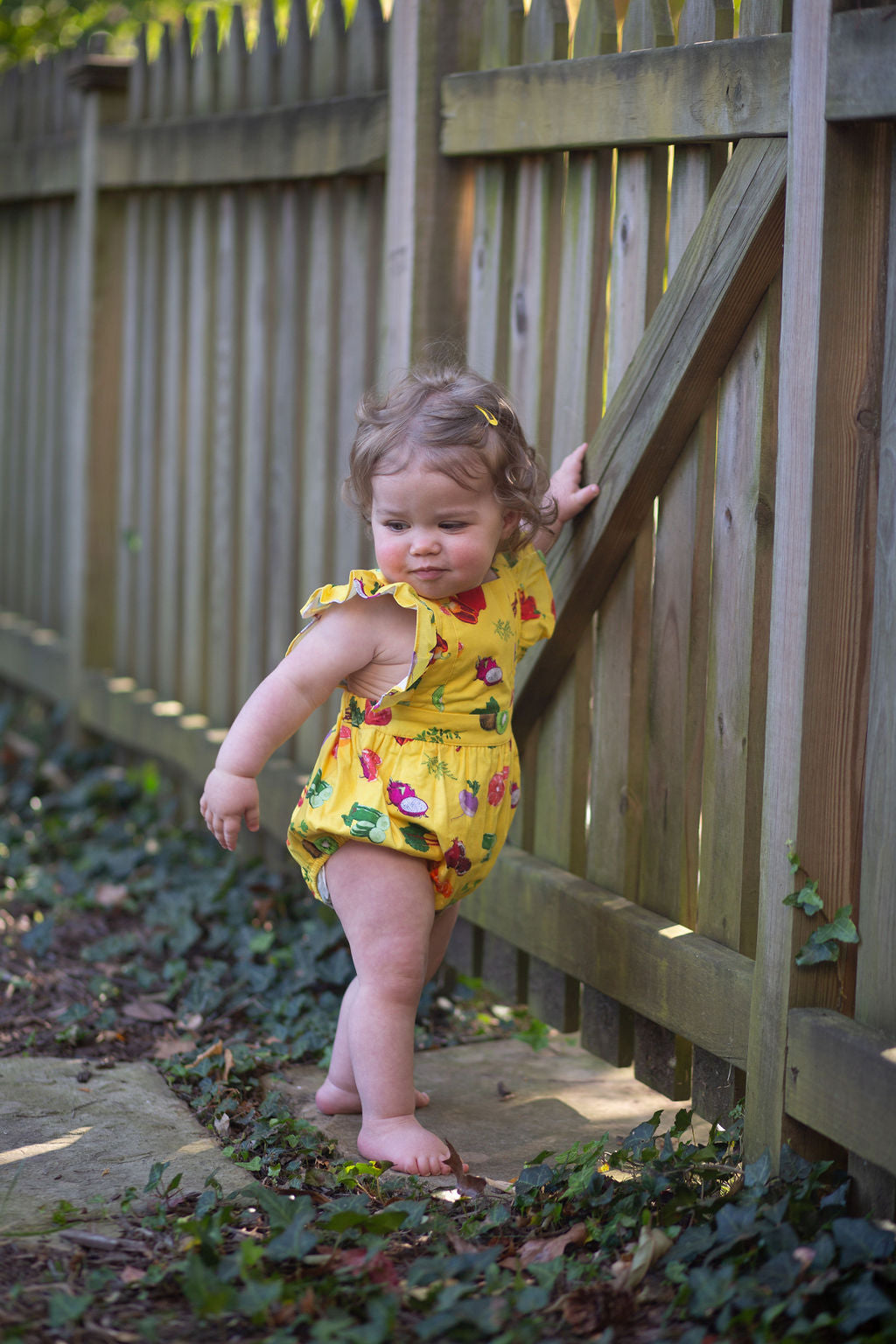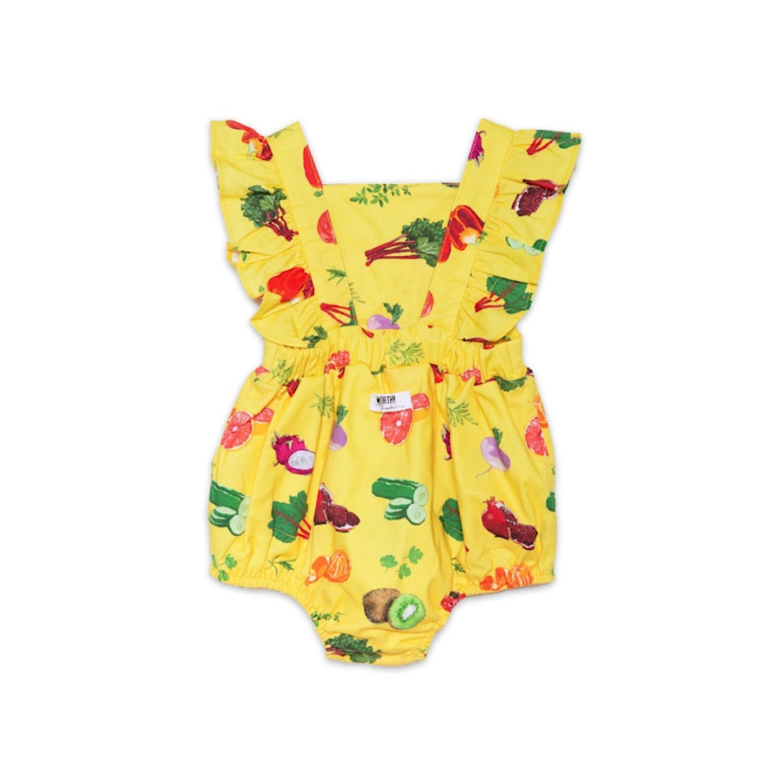 The bubble romper features ruffle straps and a snap closure, and the veggie print is impossible to resist!