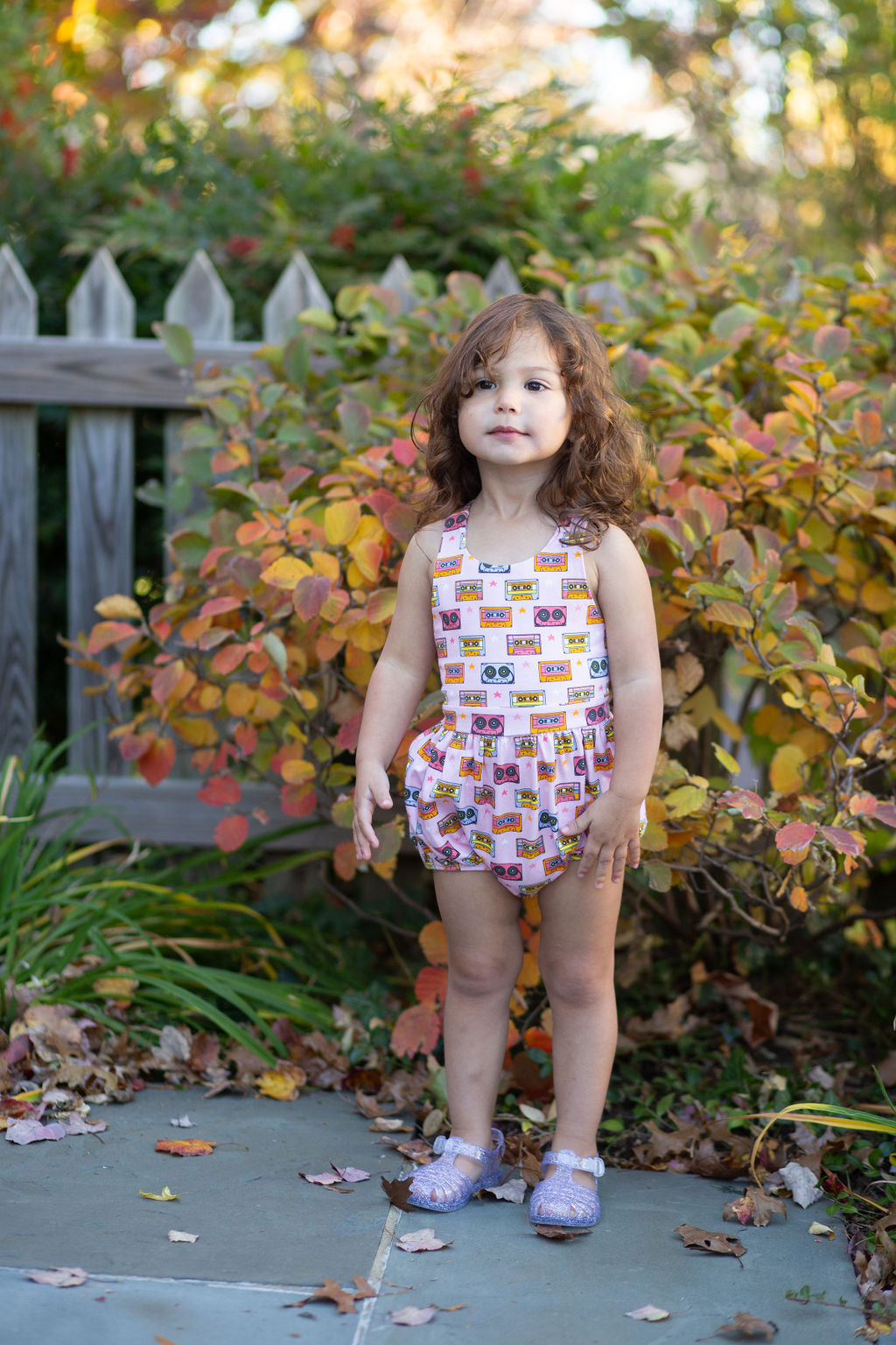 Our pinafore style bubble romper in our Cassettes and Stars print will have your little one picture ready.  This unique print is perfect for warm weather!