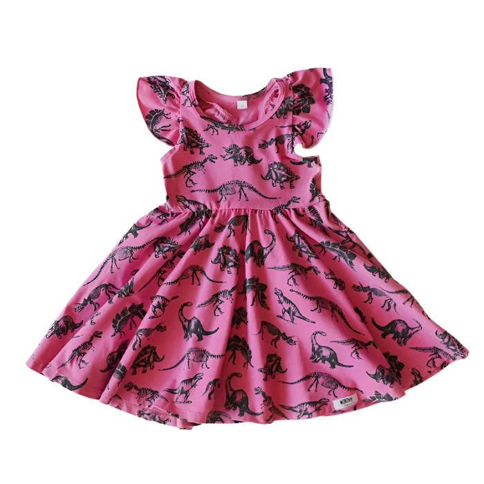 One of our favorite designs features a racer back bodice with a ruffled shoulder, and the twirl we all love.  The hot pink dinosaur print will make it a summer favorite!