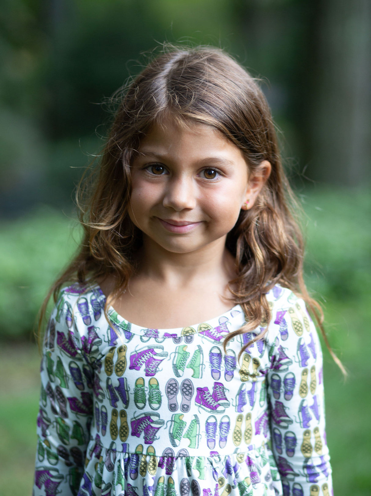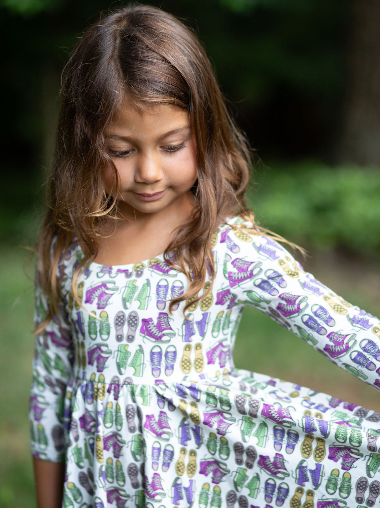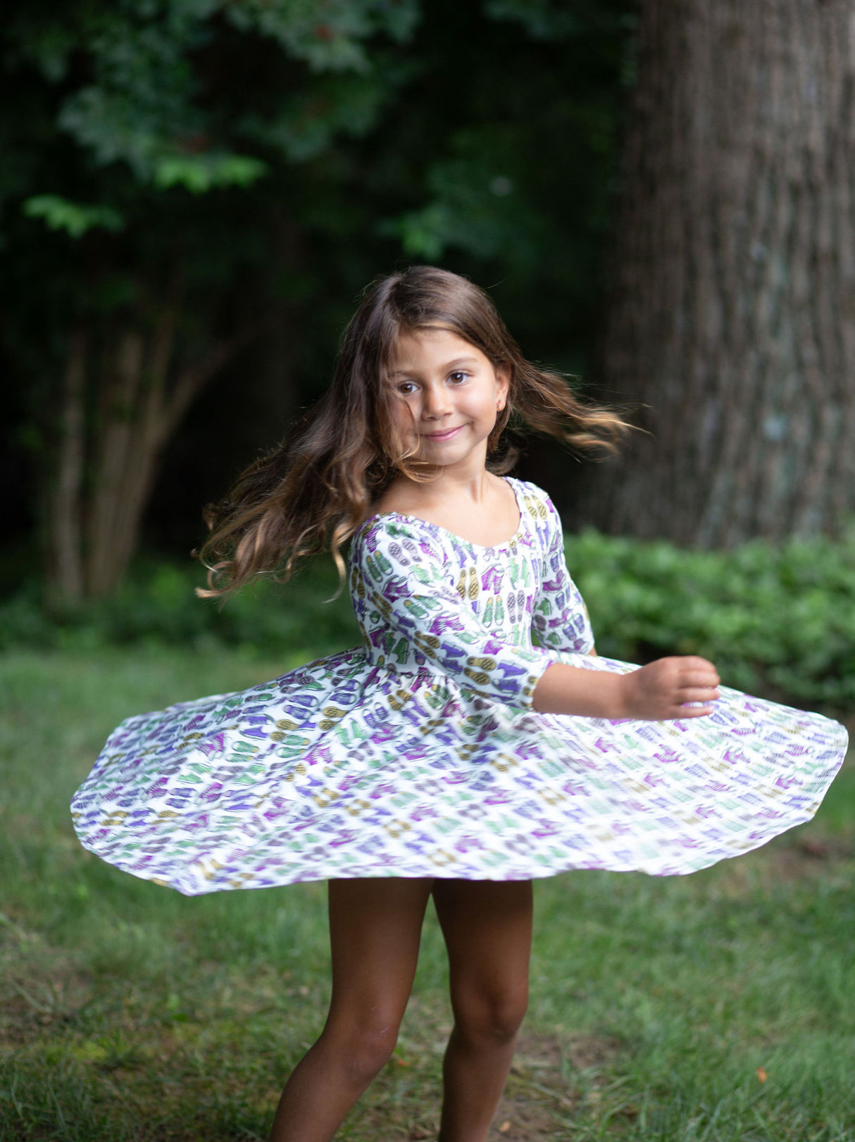 Our best selling design is a girls knit dress with a scooped back and the perfect amount of twirl! Perfect twirly dress for Back to School